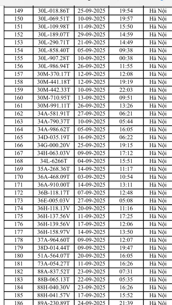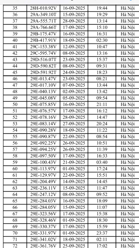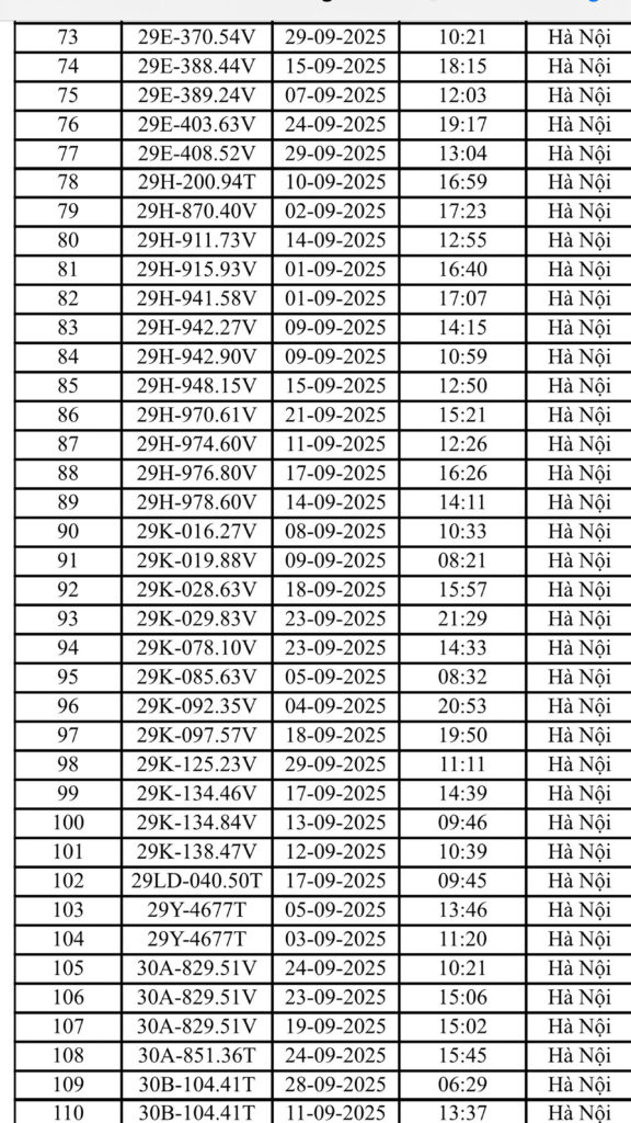 Dưới đây là danh sách chi tiết 221 xe bị phạt nguội tháng 9/2025 tại Hà Nội: